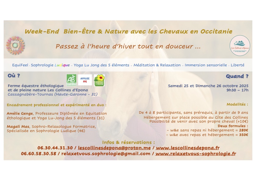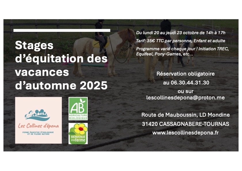 - le vendredi 28 février 2025 de 14h à 17h : stage d’équitation éthologique (initiation / perfectionnement), pour cavalier à partir du niveau Galop 3, avec possibilité de venir avec son cheval /poney,