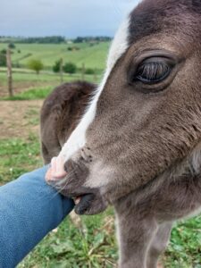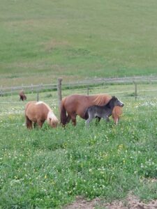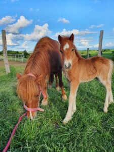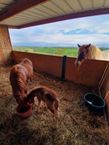 Nous faisons saillir en alternance au maximum tous les 2 ans nos juments ou ponettes, le temps qu’elles vivent pleinement leur gestation, la mise bas et leur récupération, et que les poulains grandissent et commencent leur sociabilisation au contact du troupeau et des humains jusqu’à leur sevrage autour de l’âge de 10 mois, où ils pourront commencer à rejoindre leur nouvelle maison en confiance sélectionnée avec soin.